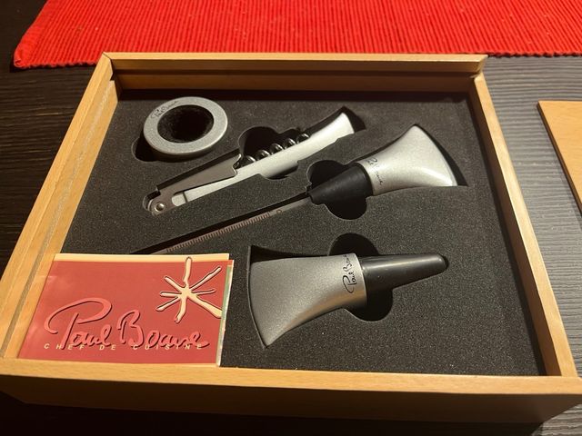 Set da bottiglia vino Paul Bocuse da 4 pz Con elegante scatola di legno Nuovo mai utilizzato Cavatappi con coltellino, termometro, tappo e collare salvagoccia