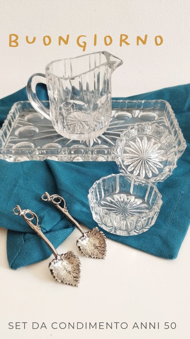 Set da condimento anni 60 composto da vassoio con piccolo bricco per l'olio e due figlie sale e pepe con relativi cucchiaini