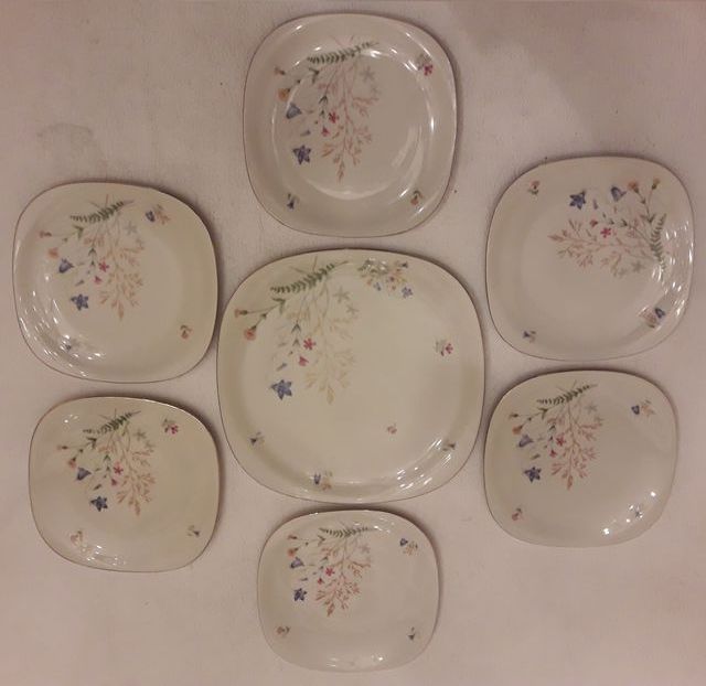 Bordi dorati e stesso disegno floreale su ogni piatto.