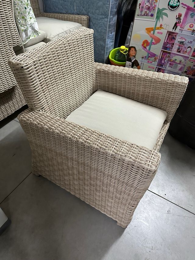 Dettagli del prodottoSet da giardino o veranda composto da divano e due poltrone. Tutte corredate di cuscini. Il divano è lungo cm. 165, profondo cm. 70 e alto cm. 74. Le poltrone sono lughe cm. 72, profonde cm. 70 e alte cm. 74. La struttura è in acciaio.