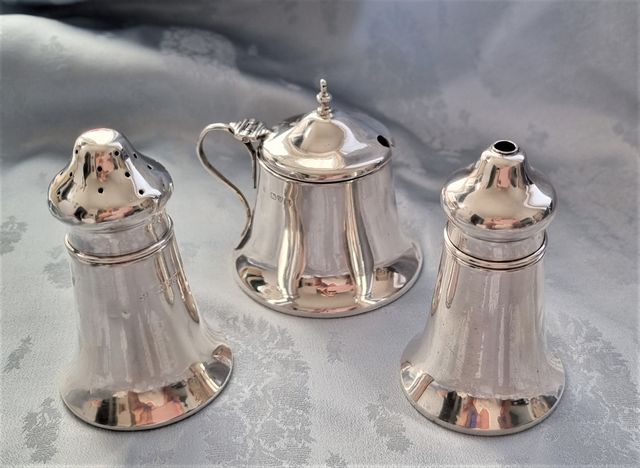 Dettagli del prodottoAntico servizio da tavola in argento 925/1000, composto da spargisale, spargipepe e mostardiera.