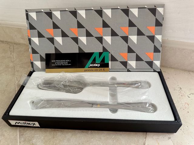 Dettagli del prodottoSet da torta composto da paletta e coltello da torta in acciaio inossidabile 18/10 e decorazioni in oro zecchino 24 kt in confezione originaria della ditta Morinox. Il set e' nuovo sarà accuratamente imballato e spedito.