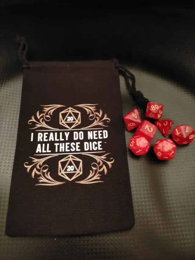 Set di dadi per giochi di ruolo come Dungeons & Dragons, completo di sacchetto. - Dadi poliedrici. - Sacchetto nero con scritta I REALLY DO NEED ALL THESE DICE.