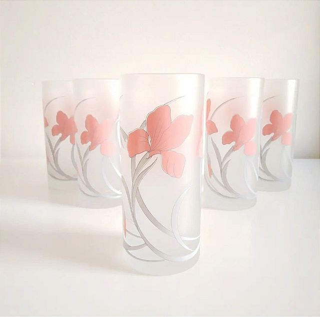 Dettagli del prodottofavoloso set di 6 bicchieri da bibita prodotti dal marchio Cerve negli anni 80 in vetro opalino con decoro di fiore rosa e grigio. Condizioni perfette . Nel mio armadio puoi trovare anche i piatti pizza presentati nell'ultima foto
