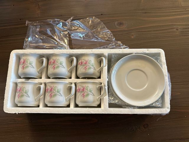 Dettagli del prodottoServizio in porcellana anni ‘90, composto da 6 tazzine da caffè con piattino.
