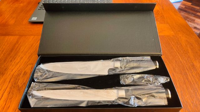 Set di coltelli da cucina professionali con affilatore. Lama da 8 pollici. 3 pezzi. Perfetti, mai usati. Confezione originale con piccoli difetti