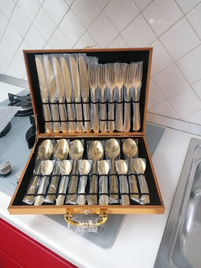 Dettagli del prodottoSet di posate da 24 pezzi in acciaio con valigetta. Cucchiai cucchiaini coltelli forchette acciaio inossidabile di alta qualità lucidato a specchio bordo liscio antiruggine e anti corrosivo lavabile in lavastoviglie design classico e robusto. Color oro. In regalo questo bellissimo orologio a vostra scelta.