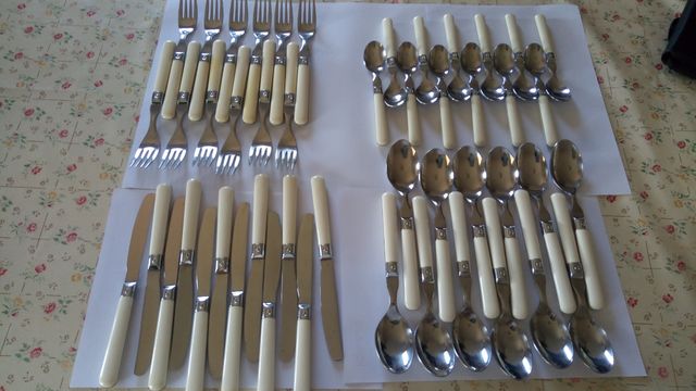 Dettagli del prodottoVendo il completo di posate vintage che vedete in foto, le posate sono 12 per ogni tipo , cucchiaio, forchette, coltello e cucchiaini, Le forchette presentano delle macchiette gialle sul manico ( vedi ultima foto), non sono perfette perché usate in passato ma fanno ancora la loro figura, appartenevano a mia nonna ..la scatola che vedete nella foto non è originale ma solo per appoggio, quella originale non ce l'ho più