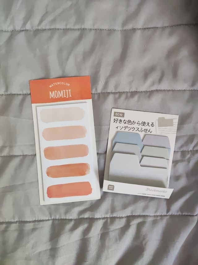 - uno sui toni del grigio e dell'azzurro composto da segnapagina/post-it di dimensione compresa tra 4,5 x 7 cm e 7 x 7 cm.