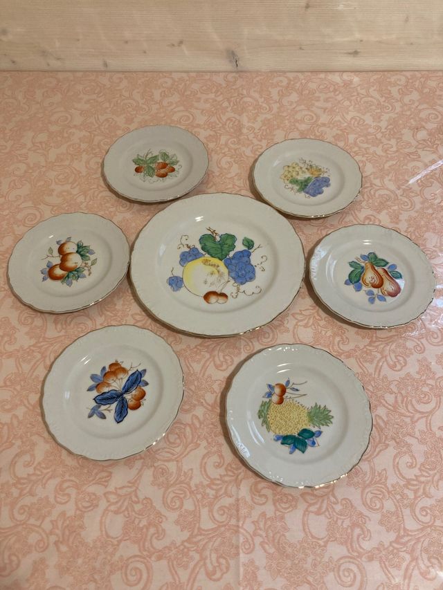 Set Servizio piatti da dolce Piatto torta+ 6 piattini Con disegni di frutti Marchio Royal In ottime condizioni.