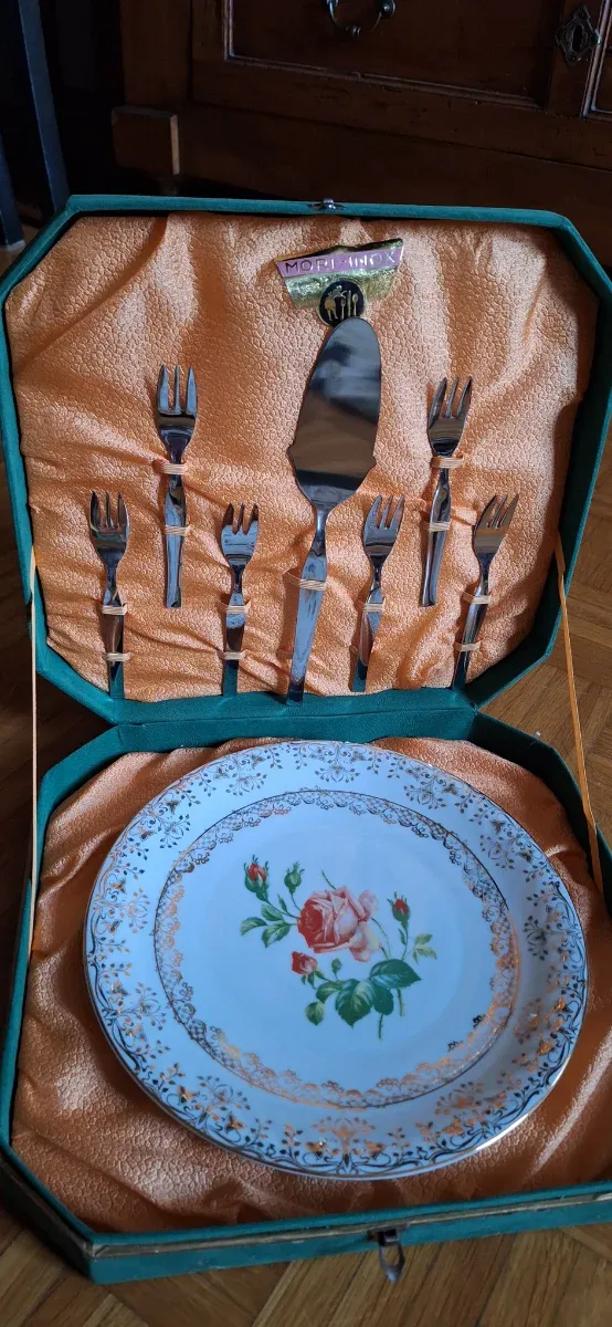 Dettagli del prodottoElegante set da dolce vintage, perfetto per occasioni speciali. Include un piatto decorato e sei posate.