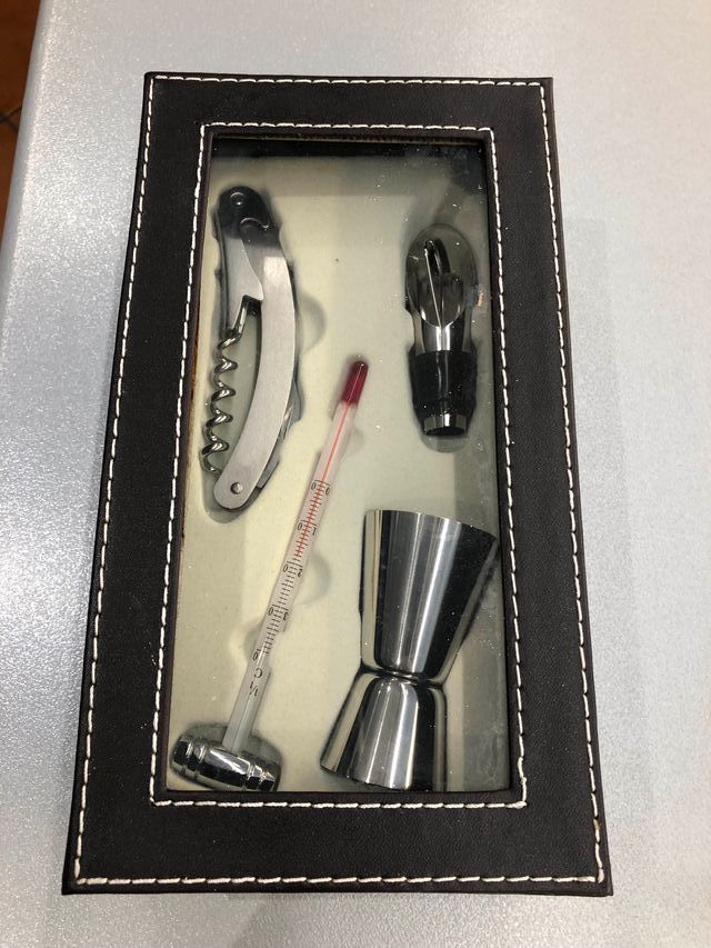 Dettagli del prodottoSet vino in scatola in ecopelle e vetro trasparente da 4 pezzi che comprende un cavatappi, un tappo in acciaio inossidabile, un termometro e bicchierino- 3 pezzi in tutto 3 Euro cad/uno