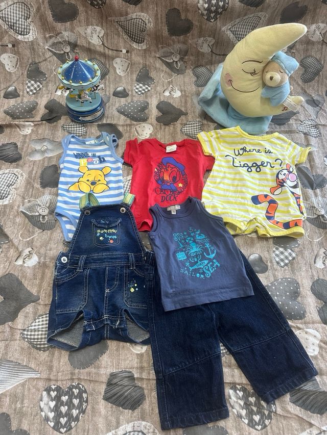 Dettagli del prodottoSet taglia 3 mesi composto da 1 body, 1 salopette, 1 pagliaccetto, 1 t-shirt Benetton, 1 canotta, 1 paio di jeans. Tutto in ottime condizioni. 3 paia di calzine in omaggio. Alcuni articoli hanno le etichette interne tagliate