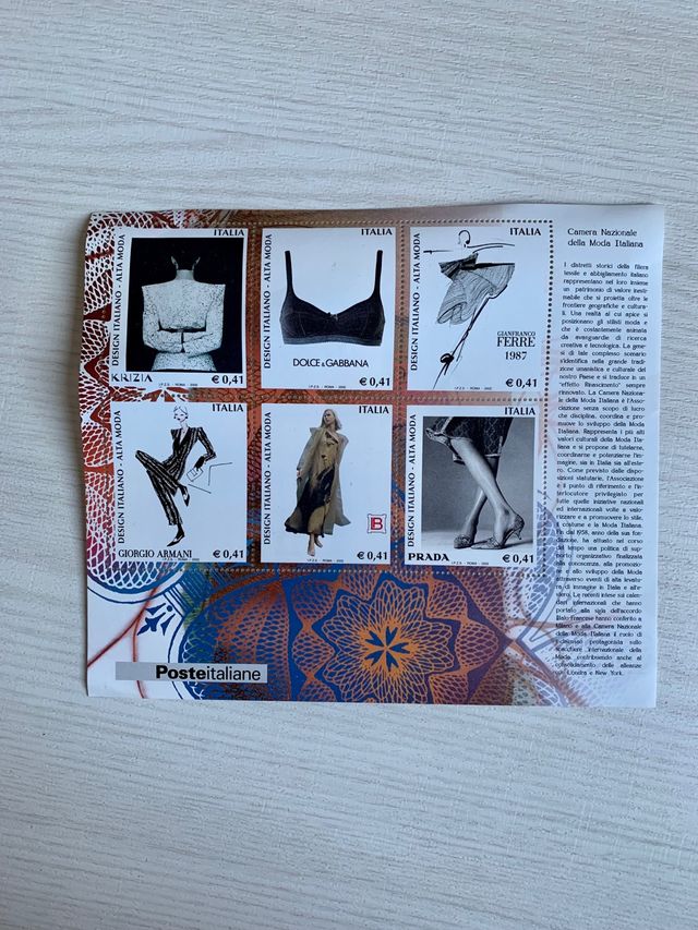 Dettagli del prodottoi francobolli celebrativi delle più raffinate creazioni di moda italiana. Il 30 agosto 2002 venivano emessi francobolli celebrativi delle creazioni di Armani, Krizia, Gianfranco Ferrè, Dolce & Gabbana, Prada