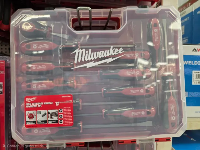 Set di giraviti Milwaukee con manico ad alta leva e punta magnetica. - 12 pezzi inclusi. - Punta magnetica. - Manici ad alta leva.