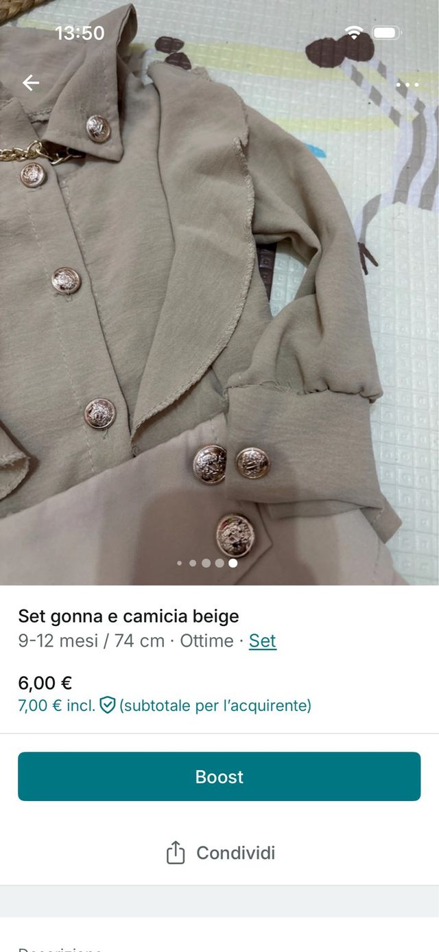Set gonna e camicia beige per bambina. - Taglia 9-12 mesi / 74 cm. - Colore beige. - Dettagli con bottoni dorati e catenina.