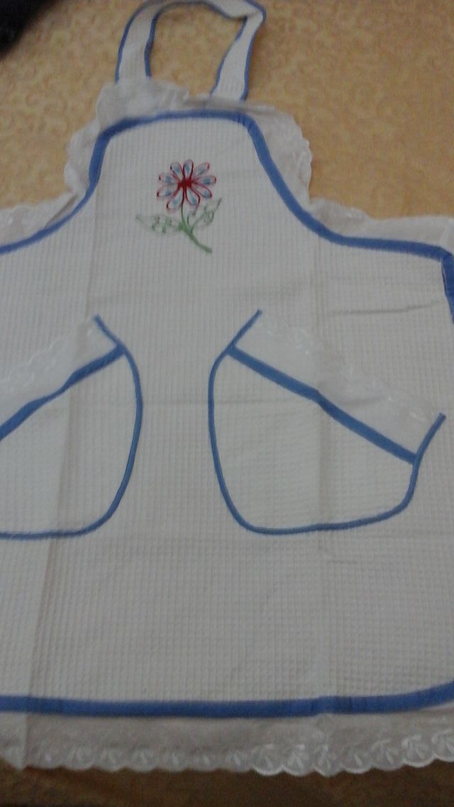 Bellissimo set grembiule e asciuga piatti ricamati . Gli asciuga piatti sono di forma tonda e si possono appendere.