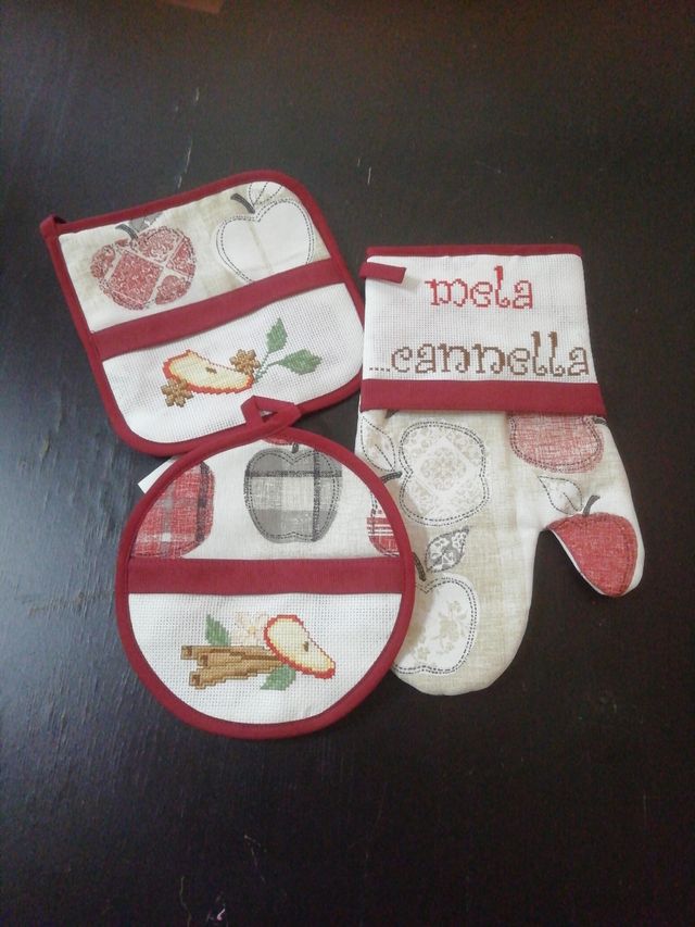 Set guantone e due presine ricamate a mano a punto croce con tema mela e cannella. Nuovi, in cotone e poliestere.