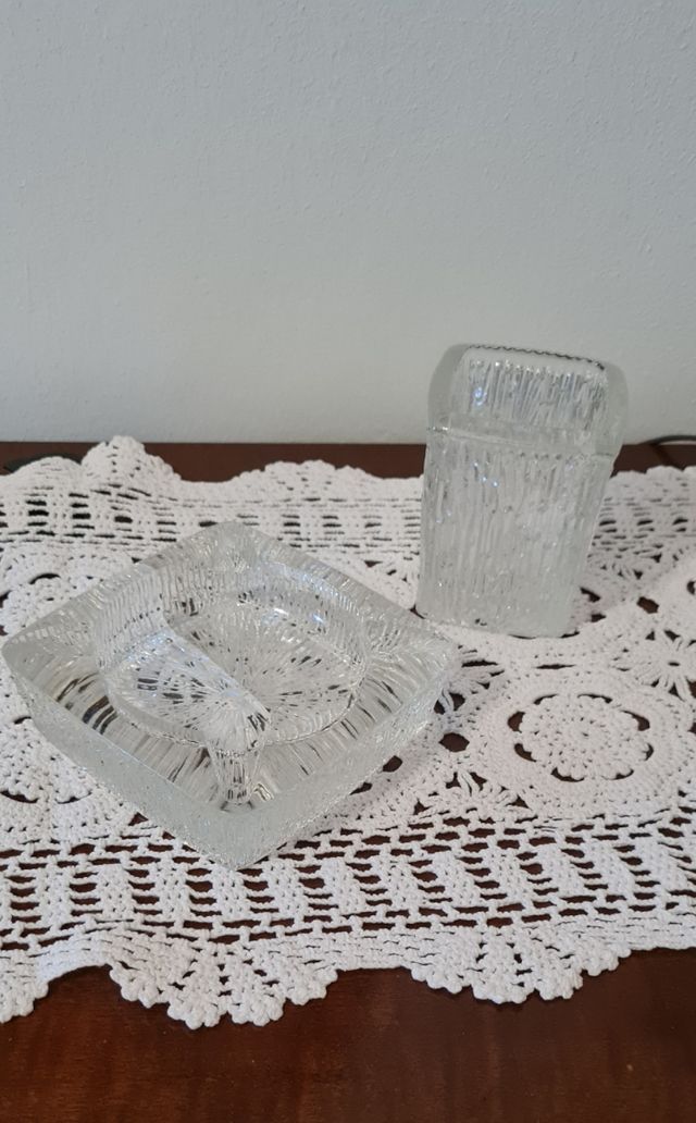 Set in vetro spesso lavorato composto da posacenere e piccolo vaso contenitore porta sigari/sigarette, stile vintage, condizioni perfette.