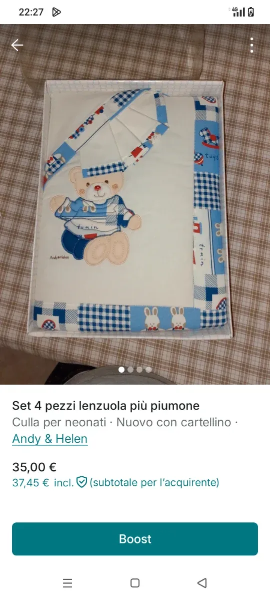 Dettagli del prodottoSet di lenzuola e piumone per culla o navicella, marca Andy & Helen. Nuovo con cartellino.