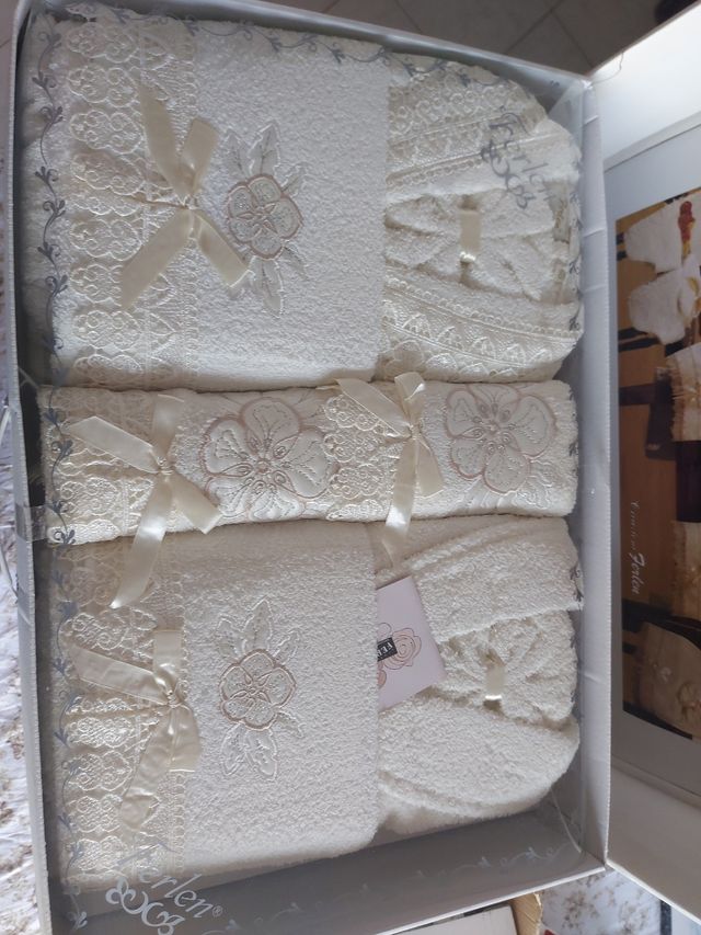 Vendo completo lui e lei, perché è stato un doppio regalo. È nuovo, mai stato usato 2 accappatoi 2 asciugamani grandi 2 asciugamani ospite 2 manopole