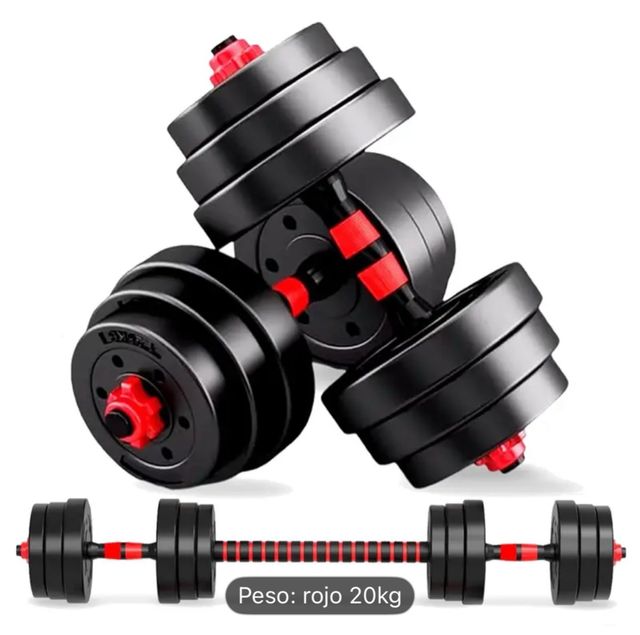 Dettagli del prodottoSet di manubri regolabili con un peso totale di 20 kg. Include una barra per convertirli in una barra.