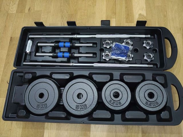 Dettagli del prodottoSet di manubri regolabili con custodia per riporli e trasportarli facilmente. Include dischi di diverso peso.