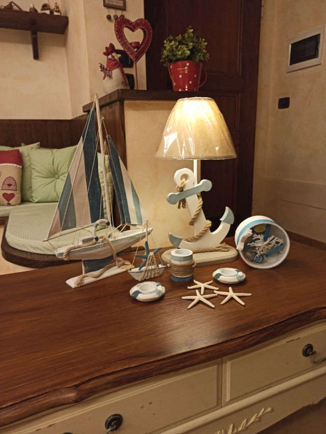 Dettagli del prodottoset di 10 pezzi tema marine con lume coppa incelofanato con gambo raffigurato ancora 2 veliero di cui 1 piccolo 3 portacandele 3 stelle marine 1 profumatore ambiente stella marina