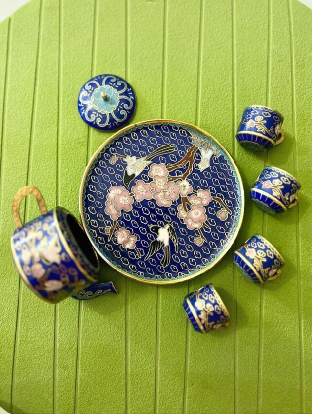 Dettagli del prodottoSet da tè in miniatura Cloisonne Fiori blu. Set composto da 7 pezzi di tazze da tè con teiera e vassoio smaltato. Il tutto in originale ceramica Cloisonne da collezione. Il colore di questo set è sorprendente e sarà un gioiello in qualsiasi collezione. La teiera è di circa 4" di diametro (incluso manico e beccuccio) x 2 1/4" di altezza. Il vassoio è di circa 4 1/2" di diametro. Ogni tazza da tè è di circa 1 1/2" di diametro (compresa la maniglia) x 1" di altezza.