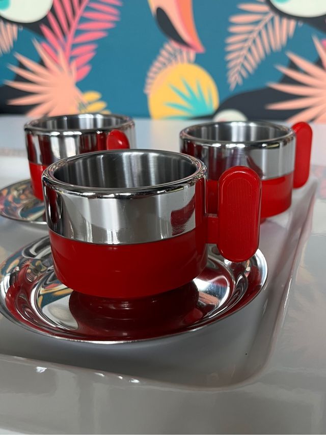 Set Morinox manifattura degli anni '70 - Modello depositato e prodotto in Italia. Composto da 4 tazzine termiche con annesso piattino + Vassoio.ABS Plastica infrangibile e Acciaio Inox 18/10 ITALY cup coffee.Con logo sulla base.Tutto esattamente come da foto.