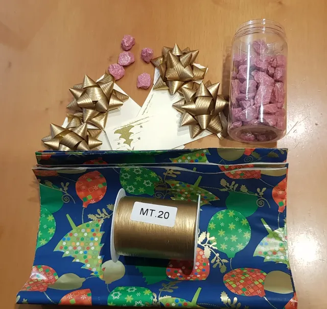 Dettagli del prodottoSet completo per confezionare regali di Natale.