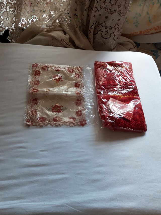 Nuovissimi due asciugamani con la scritta Auguri e centro natalizio rettangolare nella loro confezione originaria