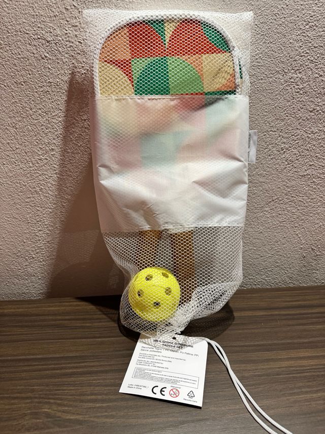 - Include 2 racchette in legno e plastica, una pallina e una sacca in poliestere.