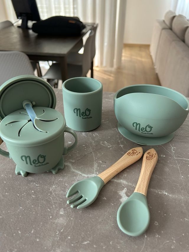 Set pappa in silicone, colore verde salvia, marca Neo. Include bicchiere, ciotola, bicchiere con cannuccia e posate. mai usato.