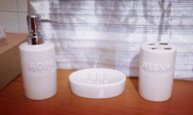 Set accessori per il bagno composto da porta sapone dosatore, porta spazzolini (4 posti) e porta saponetta. Nuovo, con scatola dell'imballaggio. #accessoribagno