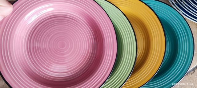 Set di 27 piatti: 9 fondi, 9 piani e 9 da frutta in vari colori in pietra