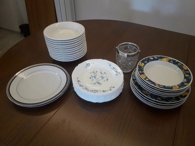 Edit: 3 piatti piani e 3 piatti fondi della pila a destra (tema floreale in blu) sono stati venduti.