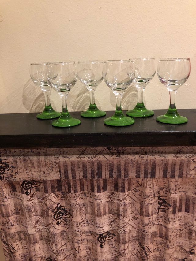 Set di piccoli bicchieri con base di colore verde. Mai usati e tenuti sempre esposti in vetrina