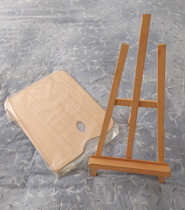 Idea regalo per appassionati di disegno e pittura: 2 tele diverse dimensioni, piccolo cavalletto da tavolo, tavolozza, scatola con sei tubetti e 2 pennelli piatti di diversa larghezza