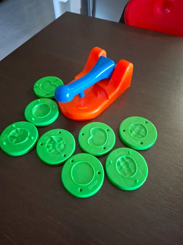 Set di stampini Pongo Dido' per creare panini. - Include 8 stampini verdi con diverse forme e scritte. - Un accessorio arancione e blu per comporre i panini.