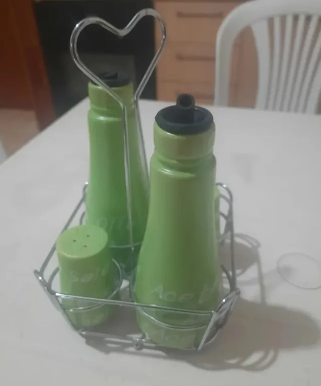 Dettagli del prodottoElegante set porta oliera e sale in ceramica verde, perfetto per la tua tavola. Il design moderno con manico a forma di cuore aggiunge un tocco di stile.