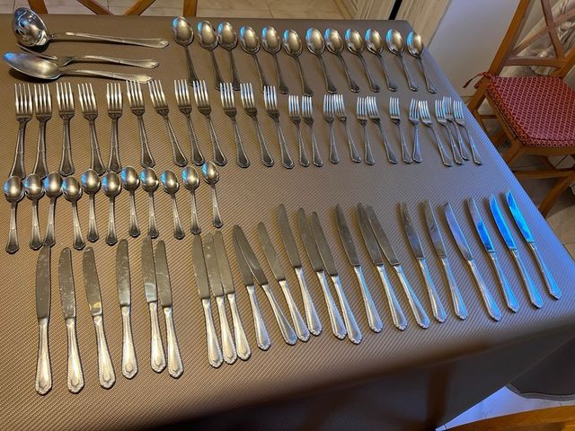 Dettagli del prodottoSERVIZIO POSATE da 12 in INOX - ARGENT - marca PRANDELLI. Servizio completo posate Prandelli inox-argento (acciaio inox con bagno in argento) - 12 persone, per un totale di nr. 74 pezzi, composto da: 12 forchette -12 cucchiai - 12 coltelli - 12 forchette piccole -11 cucchiai piccoli - 12 coltelli piccoli , 1 forchettone - 1 cucchiaione -1 mestolo. ottima qualità senza confezione originale.