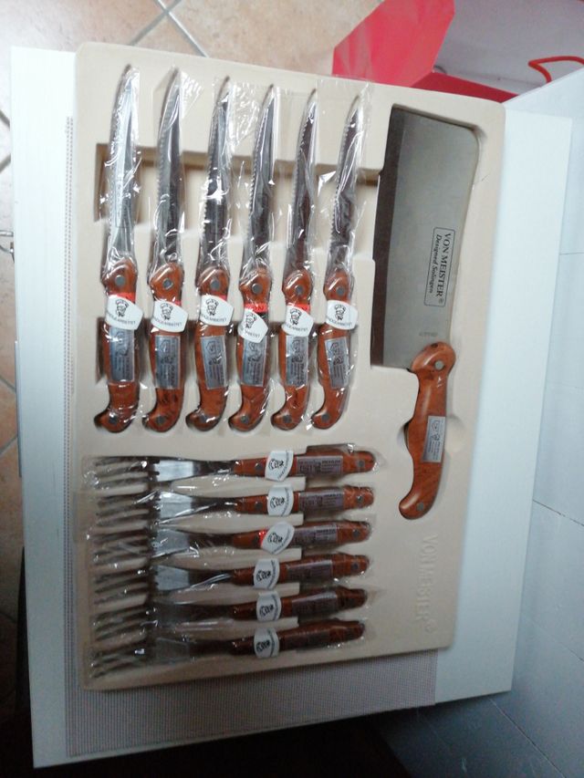 Dettagli del prodottoSet posate più accetta per costate e bistecche, 6 coltelli e 6 forchette più attrezzo per tagliare carne. Acciaio lavorato a mano, inox Misure del prodotto