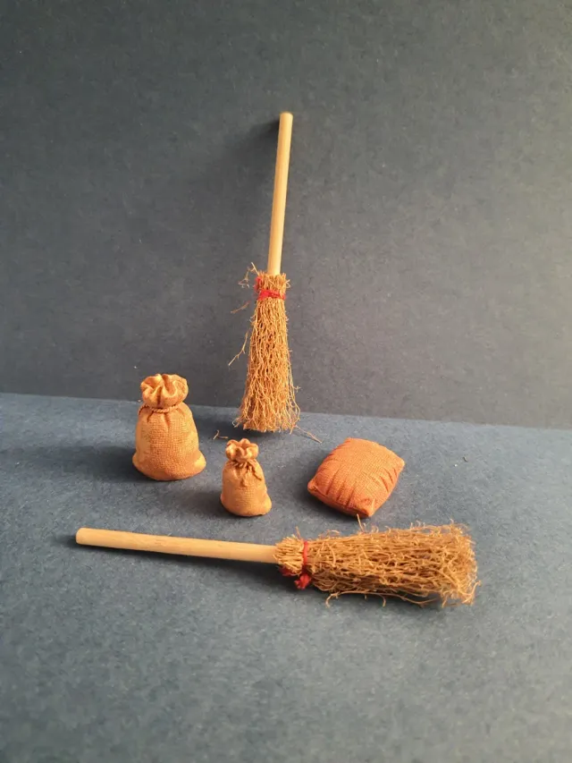 Set di accessori per presepe. - Sacchi in simil juta, 3 misure, in resina. - Scope in miniatura in legno e saggina. - perfette per presepi (Thun)