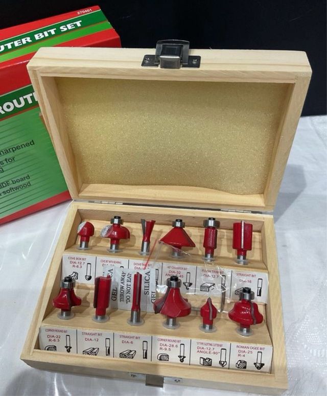 Dettagli del prodottoSet di frese per fresatrice in legno, completo di custodia.