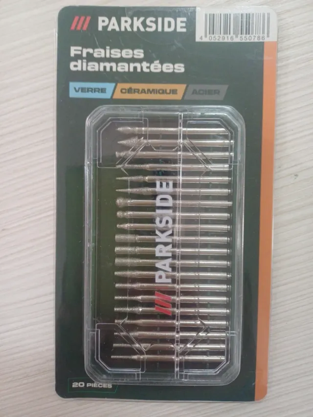 Set di 20 punte diamantate Parkside. - Ideali per vetro, ceramica e acciaio. - Utili per lavori di precisione e incisione.