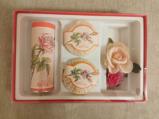 Confezione regalo nuova. 1 borotalco 100gr 2 saponette 2x100gr. 1 fiore finti