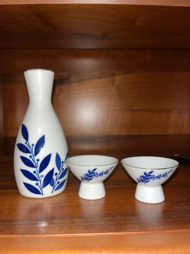 Set Sake Gekkeikan Giapponese Vintage bianco con motivi blu.