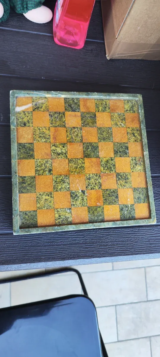 Dettagli del prodottoElegante set da scacchi realizzato in marmo. Le caselle alternate presentano tonalità di arancione e verde screziato, incorniciate da un bordo in marmo verde.