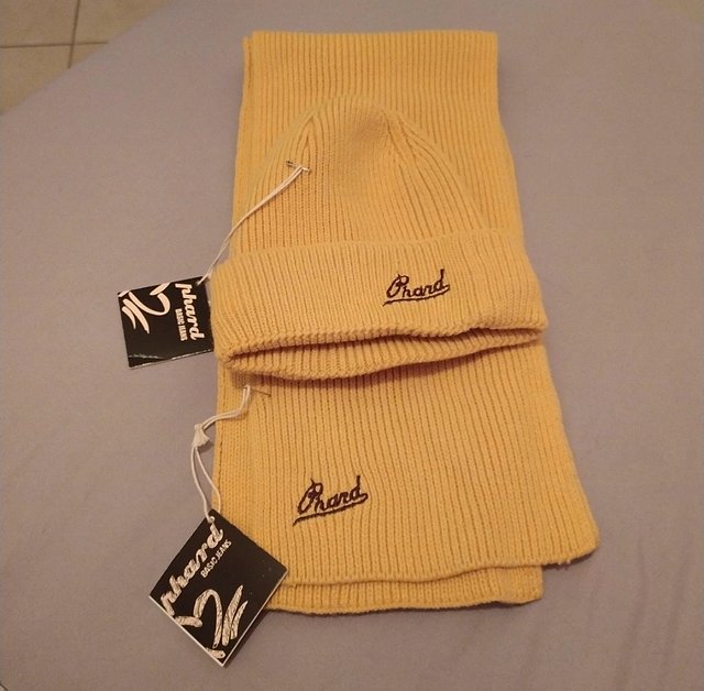 Set di sciarpa e cappello di colore giallo senape della Phard ancora con cartellini